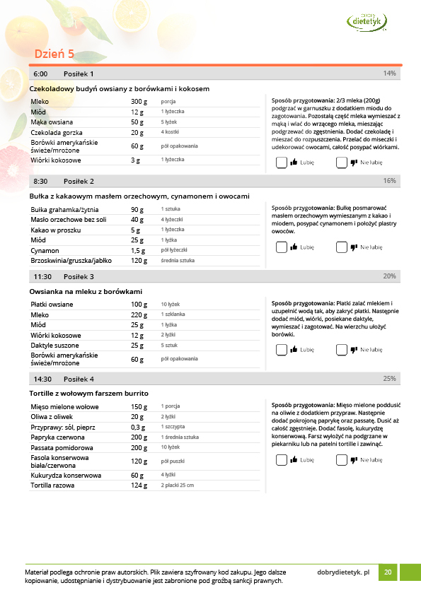 w formie precyzyjnych jadłospisów wielodniowych (na każdy dzień miesiąca jest opracowany osobny jadłospis). Tutaj nie musisz zastanawiać się co zjeść każdego dnia, gdyż będziesz mieć dokładnie wszystko rozplanowane.