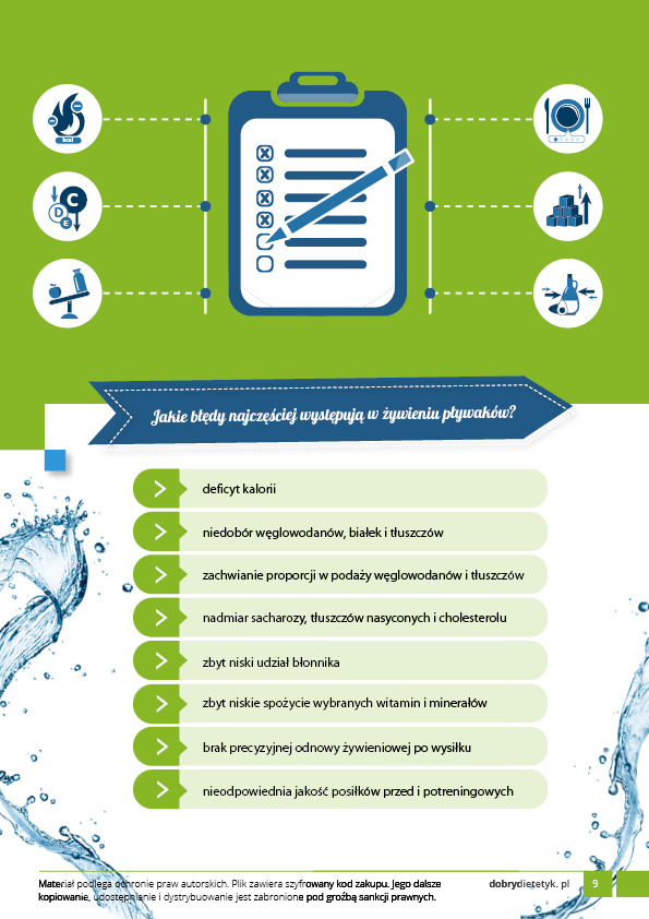 Kompleksowy program żywieniowy dla osób trenujących pływanie zawodowo lub amatorsko. Jadłospis na 30 dni został skomponowany z myślą o pływakach, tak, by wspomóc osiągnięcia sportowe i regenerację organizmu. Pierwsze posiłki w ciągu dnia doskonale sprawdzą się jako posiłek przedtreningowy (koktajle, kasze z owocami, owsianki i omlety), kolejne dania to łatwe do zabrania na wynos potrawy (kanapki, placuszki, naleśniki, jogurty). Dodatkowo jeden z 6 posiłków to naturalny, domowy izotonik przeznaczony do spożycia w trakcie treningu. Kolejność posiłków można zmieniać dowolnie tak, by dopasować w razie potrzeby do rozkładu jednostek treningowych w ciągu dnia.