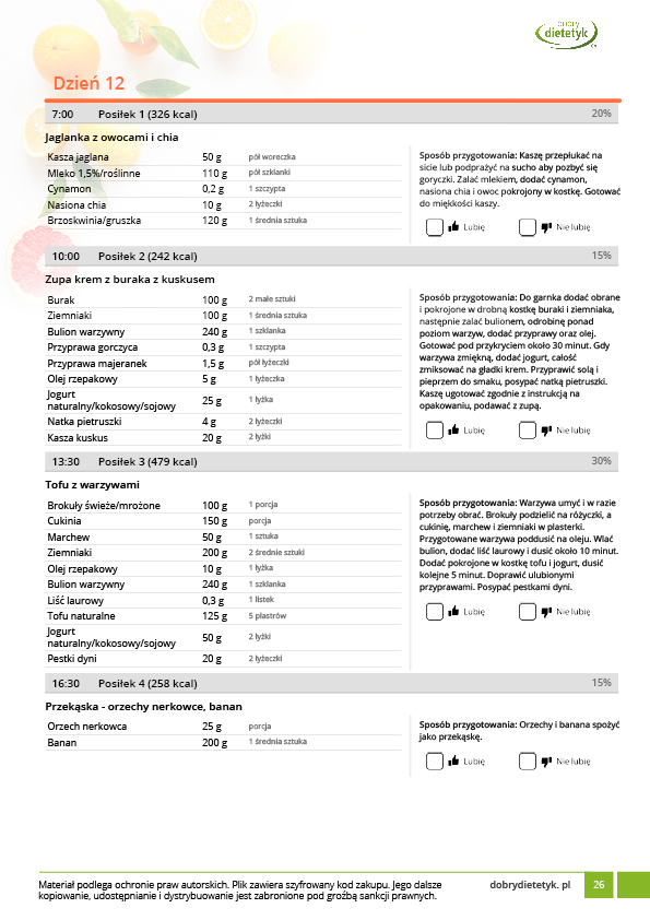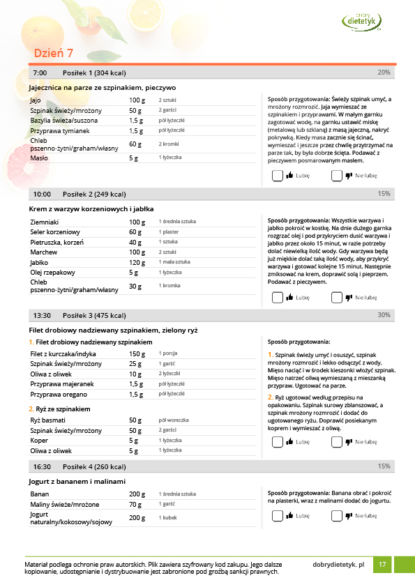 w formie propozycji posiłków (zamiast pojedynczych jadłospisów jednodniowych, przygotowano propozycje kilku propozycji dań na każdy posiłek). Tutaj nie uzależniamy Cię od tego jakie masz np. w danym dniu zjeść śniadanie czy obiad, tylko sam wybierasz sobie ulubione danie z kilku przedstawionych przez nas propozycji.
