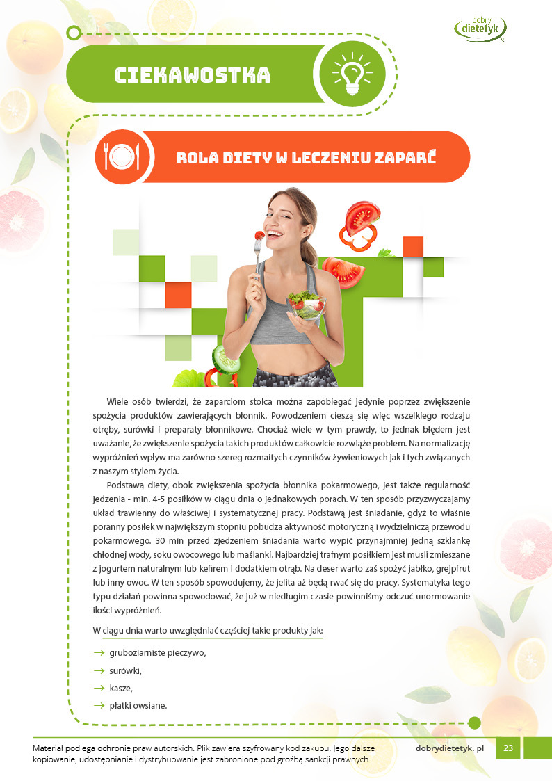 Specjalistyczny 30-dniowy Program Dietetyczny wspomagający leczenie zaparć. Dieta została opracowana przez kilkuosobowy zespół dietetyków specjalizujących się w problematyce schorzeń przewodu pokarmowego. W diecie uwzględniono zwiększoną podaż błonnika pokarmowego różnych frakcji (rozpuszczalnych i nierozpuszczalnych) aby wspomóc prawidłową perystaltykę jelit i zwiększyć częstotliwość wypróżnień. Dzięki odpowiedniemu doborowi produktów spożywczych udało się także dostarczyć wiele cennych składników odżywczych wspomagających zdrowie i kondycję jelit. Dieta polecana jest również osobom zmagającym się z problemem nadwagi.