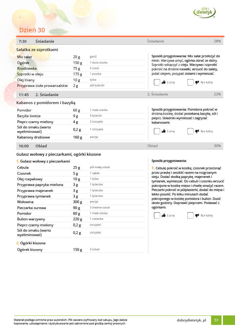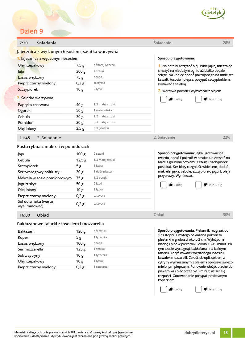 w formie precyzyjnych jadłospisów wielodniowych (na każdy dzień miesiąca jest opracowany osobny jadłospis). Tutaj nie musisz zastanawiać się co zjeść każdego dnia, gdyż będziesz mieć dokładnie wszystko rozplanowane.
