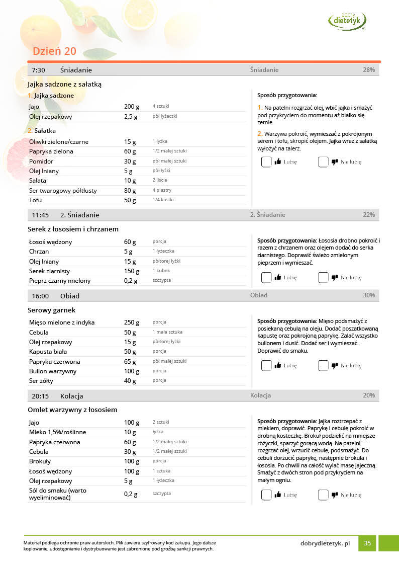 w formie propozycji posiłków (zamiast pojedynczych jadłospisów jednodniowych, przygotowano propozycje kilku propozycji dań na każdy posiłek). Tutaj nie uzależniamy Cię od tego jakie masz np. w danym dniu zjeść śniadanie czy obiad, tylko sam wybierasz sobie ulubione danie z kilku przedstawionych przez nas propozycji.