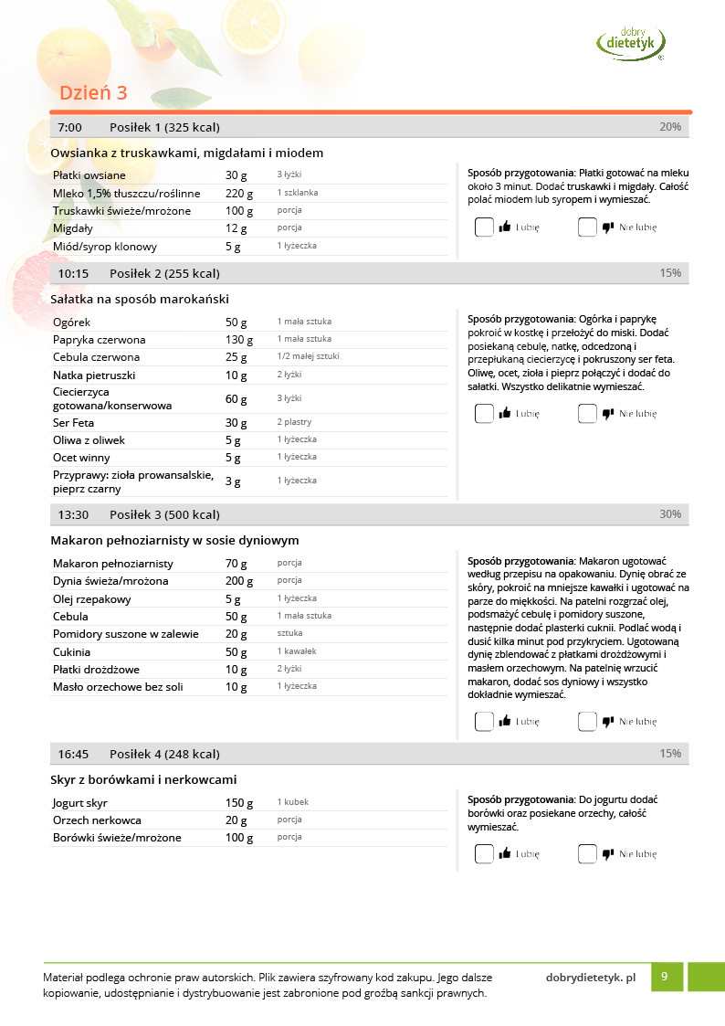 w formie precyzyjnych jadłospisów wielodniowych (na każdy dzień miesiąca jest opracowany osobny jadłospis). Tutaj nie musisz zastanawiać się co zjeść każdego dnia, gdyż będziesz mieć dokładnie wszystko rozplanowane.
