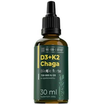 Suplement diety w kroplach, z wysoką dawką wit. D3 oraz K2 MK-7, ekstraktem chagi i siedmioma szczepami pożytecznych bakterii. Produkt przeznaczony wyłącznie dla osób zdrowych powyżej 75. roku życia.
